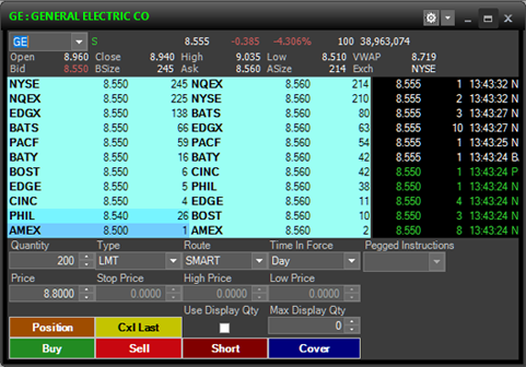 In this example you see symbol GE trading 8.55 bid x 8.56 ask.